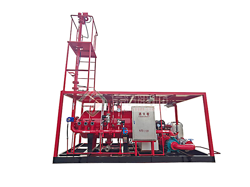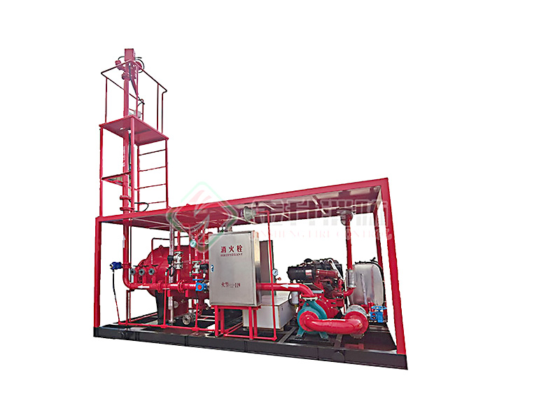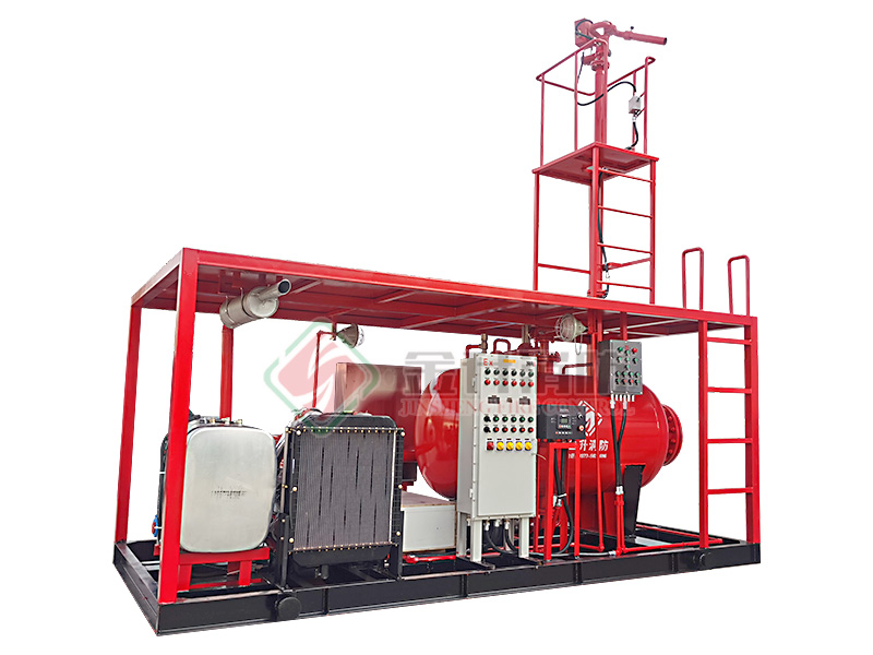 撬裝泡沫滅火裝置主要柴油機(jī)(電動機(jī))消防泵組、壓力式比例混合裝置(或泡沫液儲罐)、噴射系統(tǒng)(防爆電動消防炮)、公共底座、防雨棚、操作平臺及爬梯、防爆控制柜、消防器材箱、消防水帶、泡沫槍與連接管路等組成。機(jī)組采用柴油機(jī)(或電動機(jī))為動力。